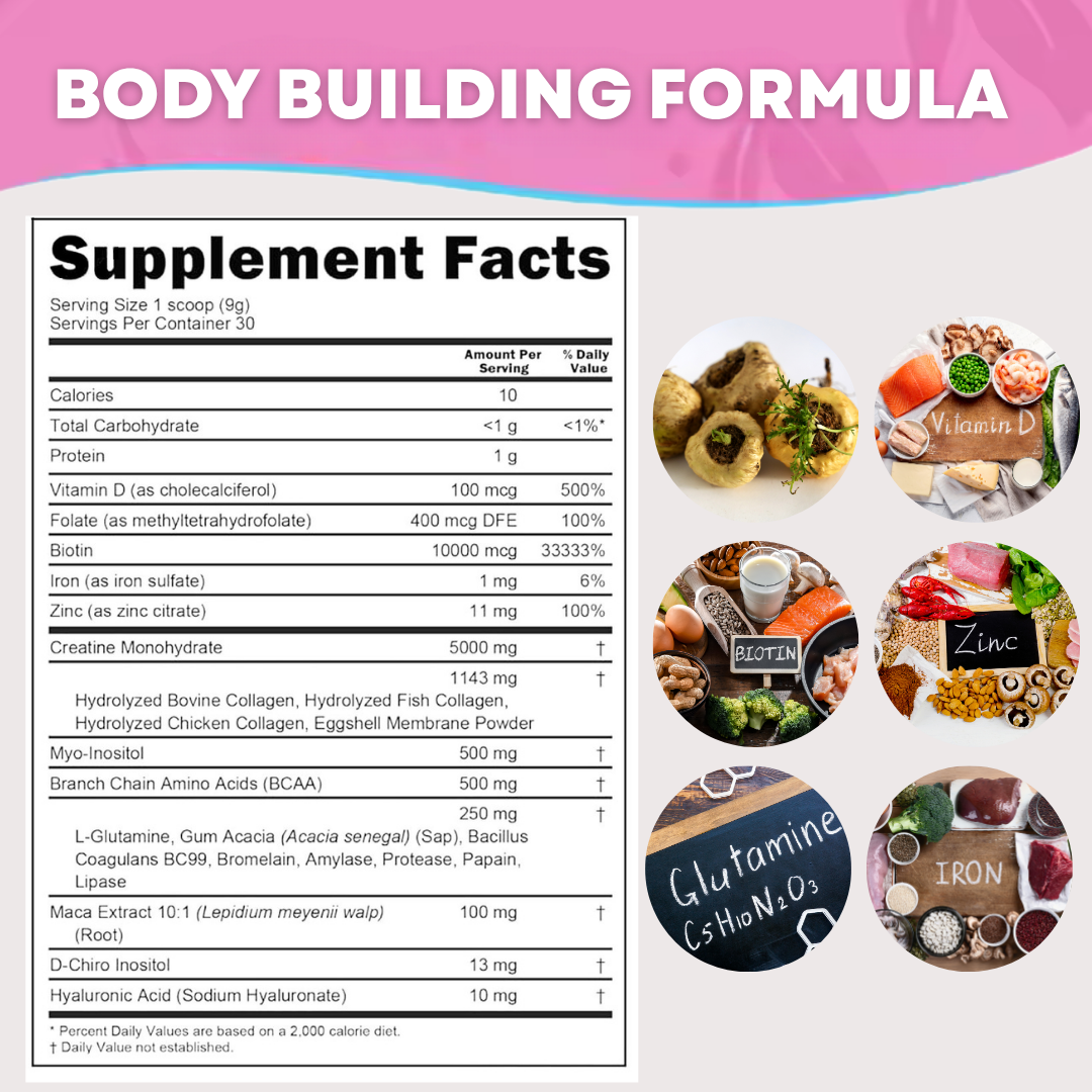 Collagen Peptides, Biotin, Zinc, and Hyaluronic Acid promote smoother skin, stronger nails, and healthier hair growth. Visible benefits even if you never lift a weight.